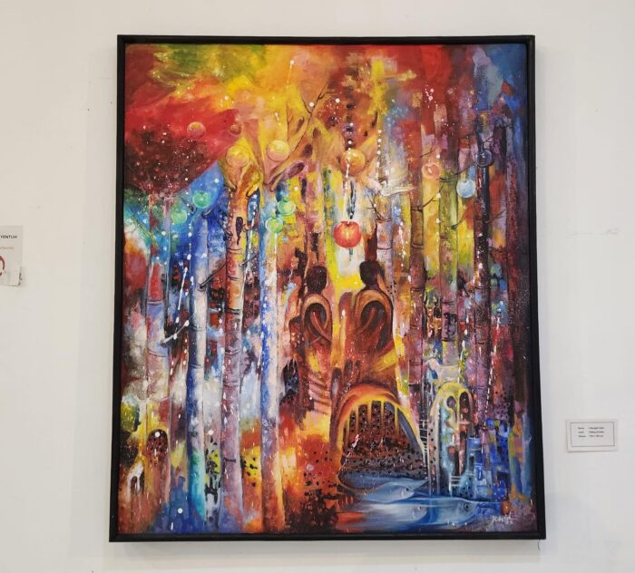 Karya kedua berjudul “Dialog di Eden” (120 x 100 cm, acrylic on canvas). Eden, taman yang indah dan penuh warna, digambarkan sebagai ruang awal relasi harmonis antara manusia, alam, dan Tuhan. Pohon-pohon berbuah warna-warni, binatang yang bersukacita, dan suasana yang menyenangkan menjadi latar visual yang memikat. Namun, di balik keindahan itu, tersimpan kritik yang tajam.