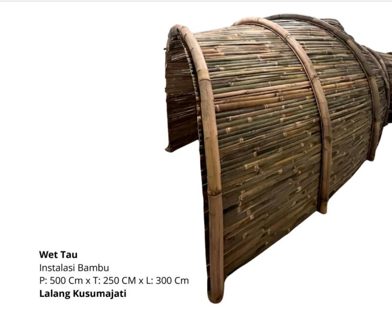 Bertajuk Wet Tau, karya ini membentang dalam dimensi besar, panjang 500 sentimeter, tinggi 250 sentimeter, dan lebar 300 sentimeter, membangun sebuah ruang yang mengundang tubuh pengunjung masuk ke dalamnya.