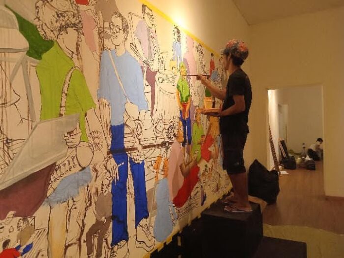 Di atas kanvas, tergambar orang-orang yang duduk, berdialog, membuka laptop, menatap layar ponsel, hingga berdiri dalam diam. Warna-warna akrilik yang terang dan mencolok menghadirkan kesan menyala, mendekati nuansa seni pop, namun tetap berakar pada keseharian.