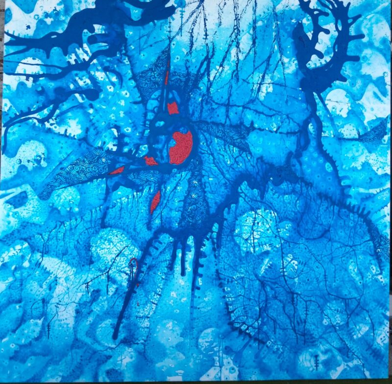 Namun dari keseluruhan karya yang dipamerkan, Tersobek-Sobek (122 x 120 cm, kanvas, cat akrilik, 2025) menghadirkan impresi paling kuat. Dominasi warna biru segera menangkap perhatian, diselingi semburat merah yang mencolok seakan menjadi simbol darah, luka, atau energi yang terlepas dari tubuh kehidupan itu sendiri.